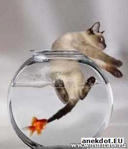 Кот пятится назад, а рыбка тянет в воду.